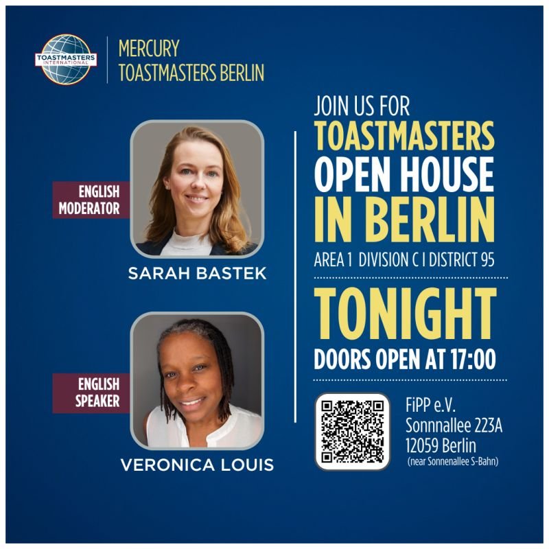 Toastmasters | International speech contest in German and English. Veronica will represent Berlin for Germany’s English speech contest, after having placed first in the Club and Area levels.